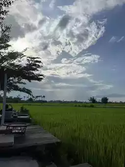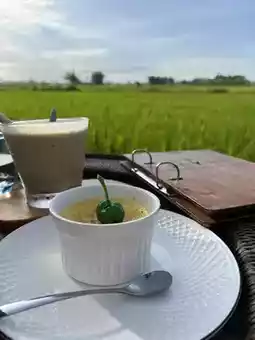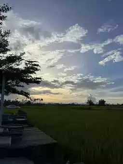 Vibe/Ambience: Think laid-back elegance: outdoor seating overlooking vast, green rice paddies. Chill, peaceful, and especially magical during rice-growing and harvest seasons. Sunset turns the whole place into a romantic haven—trust me, don’t miss dusk here.