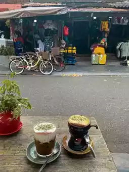 Visited this beautiful little town Hoi An which is 45 minutes away from Danang city and stumbled across this coffee store. It is strategically located in Hoi An ancient town. The café has got the rustic old school vibes, love the seatings at the balcony overlooking the street! The unique selling point here is the meticulously crafted coffee art or pairing atop the coffee! It was just too pretty to be drinking it! We ordered their egg coffee and iced salted coffee which came in fantastic presentation, wish that the egg flavour could be stronger! Overall, great place for a cuppa and have a rest after walking around the ancient town area. Chill and cozy ambiance, beautiful spot to sit and enjoy!