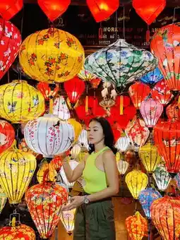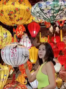 As for the highlight of the market, in addition to having a lot of things to sell, at the entrance before reaching the market, there will be a row of lantern shops. Each shop will bring lanterns to compete with each other, making most tourists like to stand and take pictures in front of the shop. Here, we can ask to take a picture with them. Props are ready, chairs are ready. Let me tell you that the picture will be beautiful and is considered a signature picture of Hoi An that you can't miss. For taking pictures at the lantern shop, the seller will charge us a little bit, around 15,000-20,000 dong (~20-30 baht).
