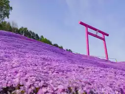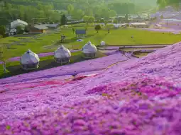 Higashimokoto Shibazakura Park in Hokkaido, Japan, is a famous cherry blossom viewing spot where visitors can admire the pink hillsides covered with shibazakura flowers. The month-long blooming period makes the park a renowned destination. Shibazakura, a ground-covering plant, mainly grows on land and during the flowering season, it blooms with small flowers about 1 centimeter in diameter in shades of pink, purple, or white. The hillsides blanketed with blossoming shibazakura create a scene like a thick carpet of flowers, offering tourists spectacular and romantic views they won't forget.