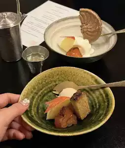 We ordered two pots of sake. When we arrived and it was cold, we ordered hot Motonoe special pure rice sake. After warming up, we ordered a pot of cold pure rice Daiginjo Kyobo. The staff mentioned that the small sake cups were made of bells. The Daiginjo was truly sweet and delicious. Sake paired with Kaiseki is a perfect match!!