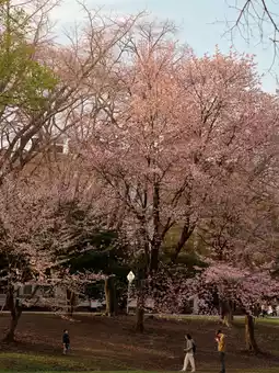🌿 There's a beautiful cherry blossom path lined with tall sakura trees. When the wind blows, the petals fall like snow — it’s absolutely dreamy.