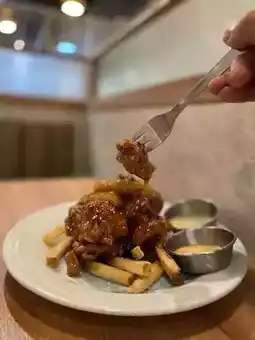 Fried chicken: The fried chicken here is boneless and boneless, and there are 6 flavors: original, sweet and spicy, honey, cheese, volcano and sauce garlic. This time we chose soy sauce garlic. The fried chicken is fried to order, hot, crispy on the outside and tender on the inside, rich in juice, rich in soy sauce, and with a hint of garlic.