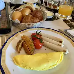 The Chinese set includes fried silver needle noodles, two dim sum and a fried crispy custard bun. It is worth mentioning that this bowl of ordinary porridge is very soft and fragrant, and it is very delicious. Western breakfast includes cereal, format bread with jam and cream, omelette potato wedges and pork sausage. We were reluctant to leave right after the meal. Sitting here, admiring the gorgeous architecture and listening to the string music was also a kind of enjoyment.