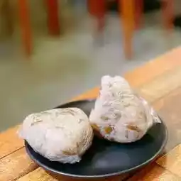 The rice balls are made with Japanese rice, minced meat, burdock, and barbecue sauce.