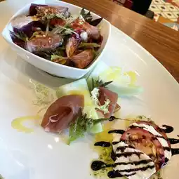 Seafood platter: Parma air-dried ham with honey-sweet melon, Thai cured beef salad, tomato cheese