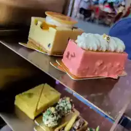 Deep sea blue crab salad sandwich with citrus sauce, rural wild mushroom meat pie with pickled vegetables, vanilla cheese quinoa balls, baked onion bacon omelette, tropical cheesecake, coconut mango cup, pomegranate banana mousse cake, English muffin with jam and cream