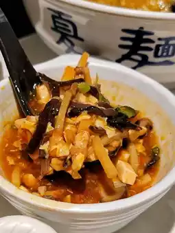 The spicy and sour soup is very spicy and slightly sour. It contains shredded pork, shredded winter mushrooms, shredded scallions, etc. It is full of flavour and very appetizing.