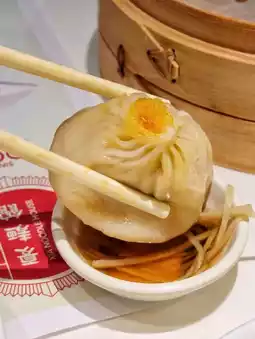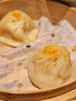 The steamed dumplings are served hot. The big steamed dumplings are wrapped with broth and meat filling. The crab powder and broth blend into one, which is full of freshness.