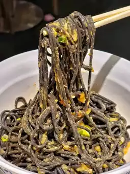 Large bowls of crab powder bibimbap, hand-cut noodles with bouncy squid sauce, paired with crab roe crab powder, rich flavor.