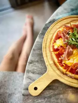 The pie base is thin and crispy, the tomato base is sour and sweet, the cheese is shredded, and Parma ham and cherry tomatoes are added on top.