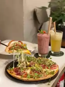 This pizza is really heavy ingredients😈 It added a lot of and thick cheese Cheese control should feel quite good 🧀🤭 In addition toppings have tomatoes and Spanish ham eat the taste is very rich taste instead of ham taken away to eat a little salty 🙈 but overall feel good!