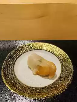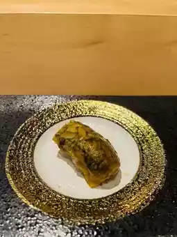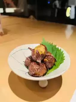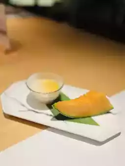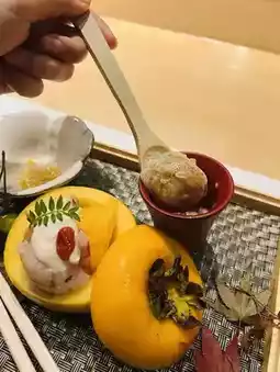 🔹Seafood cup filled with persimmons, containing wine-soaked bacon, grilled scallops, and cooked shrimp🦐 with sesame juice. The bacon is cut into slices, with a slight aroma of wine; the scallops have a fire-roasted aroma; the shrimp is crispy - and there are two small ginkgo trees.