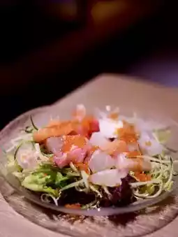 This salad also has a lot of seafood ingredients, with salmon, tuna, salmon! And at the bottom, in addition to the ordinary salad vegetables, there are plenty of strips of cut cucumber strips, very refreshing to eat! The salad is seasoned with grapefruit juice and paired with the sweetness of the sashimi, as an appetizer is a good start!