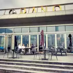 The restaurant is located in the West Kowloon Cultural District, with indoor and outdoor dining areas