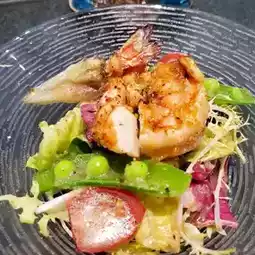 The chef first cooks the prawns on an iron plate and places them on the salad. The prawns are slightly spicy, the meat is very tender, and served with fresh salad vegetables, mixed with balsamic vinegar sauce to eat very refreshing.