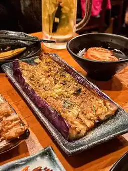 Whole eggplant with lots of Sichuan sauce and onion and garlic grilled on the side, very tasty😌