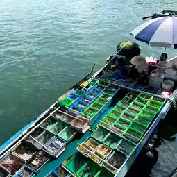 Fishermen use some small fishing gear to separate and raise the freshly caught offshore seafood for guests to choose from. Customers stand on the dock or the shore, choosing their seafood and paying. The fishermen skillfully present the seafood using long fishing rods. This is a very interesting way of trading seafood.