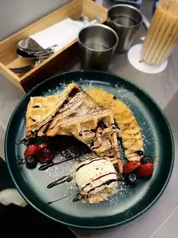 There are four pieces of waffles, freshly made, hot enough! There is a little smoky texture inside. The waffle comes with ice cream🍦, strawberry🍓, blueberry🫐, caramel banana🍌. The caramel banana is sweet and good.