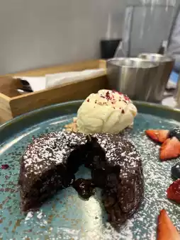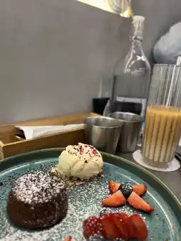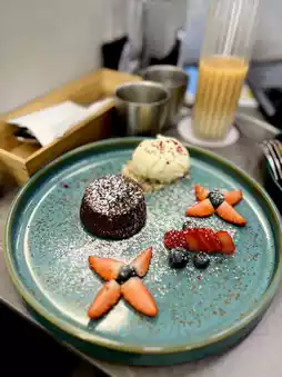 The chocolate cake is rich and sweet, a little melted. There are ice cream🍦, strawberry🍓 and blueberry🫐. They look pretty.