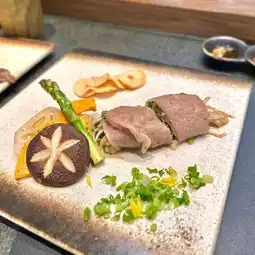A4 Kagoshima Wagyu Thin Grilled Roll, the master gently grilled the wagyu, then rolled a large amount of cooked mushrooms + onions, simply served with garlic slices, super delicious😋