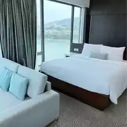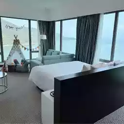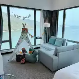 🛏️ This time I stayed in the Deluxe Room with Sea View at the "Discovery Bay Hotel". The two brothers were amazed when they entered the room! The L-shaped design of floor-to-ceiling glass all faces the sea, the room is half surrounded by the sea, the endless sea view is really beautiful, sleep in bed can see the sunrise! The room is spacious and comfortable to lie down, there are two large sofas, a very comfortable king size bed, soft and moderate mattress, I slept very comfortably that night!