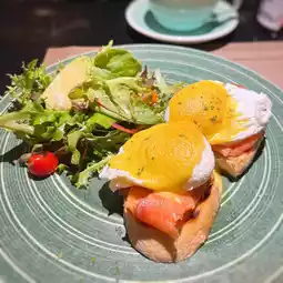 Egg Benedict can choose your own ingredients, namely smoked salmon / prosciutto / sautéed spinach, this time chose smoked salmon, smoked salmon, Benedict eggs and French bread this combination is unbeatable 😍 The egg is fluffy and very attractive, cut and melted effect full score, with hollandaise sauce to eat together very satisfying and appetizing 💯 next to the avocado salad is very fresh 👍🏻