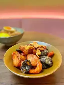 ▫️ There are original flavors, black pepper and squid intestines 🦑 rubbed with honey fried, the outer layer is sweet, with fried garlic slices to eat together more delicious 🧄