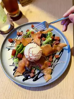 Cloth bag cheese smoked salmon salad with tomato frozen large plates, fresh vegetables, tomato frozen sweet and sour than with ordinary tomatoes more special. I feel quite full after eating🤤🤤