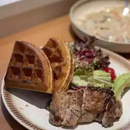 One of the store's recommendations, the teriyaki chicken is grilled, the meat is tender and juicy, the thick outer layer of the waffle is very crispy, full of egg flavor, with a little honey is delicious, served with fresh avocado salad, healthy and delicious