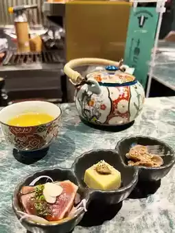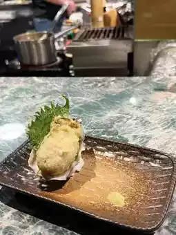 The oyster tempura and bay leaves are fried to an unusually crispy texture, and topped with green tea salt to enhance the flavor level.