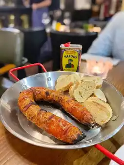 ▫️ Using traditional special utensils, the shopkeeper adds brandy and lights the fire, the sausage is roasted on the blazing fire 🔥 After roasting, it is crispy on the outside and smoky on the inside, moderately salty and spicy with a little smoky aroma 🥳