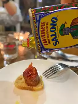 ▫️ Slice the sausage and put it on French bread 🥖 The shopkeeper suggested that it will be more fragrant with olive oil 🫒 Olive oil is packed in a small iron can, very nostalgic and cute 😛