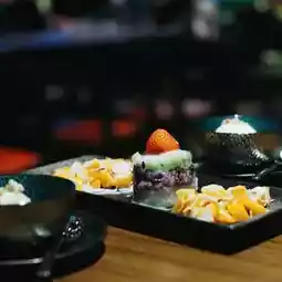 Mangoes placed on both sides, plus dried coconut flesh and coconut juice, the glutinous rice has three layers, rich flavor layers, but personally still prefer the traditional simple mango glutinous rice