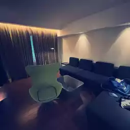 The room is decorated in grey and green tones, with gorgeous furniture and stylish decorations. The layout is very clear and detailed. The cooking area is right at the entrance, and there is a foyer for convenient placement of personal luggage and shoes. On the other side is the cooking area, which is equipped with a refrigerator, a cooking table and simple cooking utensils. Then there is the spacious living room, which has a sofa that can accommodate more than 10 people chatting at the same time. It is also equipped with a large TV, Bose Bluetooth speakers and two coffee tables for drinks and snacks, which is very relaxing and leisurely.