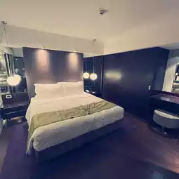 After opening the sliding door, you come to the bedroom area. There is a large bed and a row of light switches at the head of the bed, which can control the lighting in the entire room. You can adjust it to work, leisure or sleep mode as you like. It is a very detailed setting. There is a large solid wooden wardrobe and desk next to it, suitable for travelers who need to work. The other side of the room is connected to the bathroom and washroom.