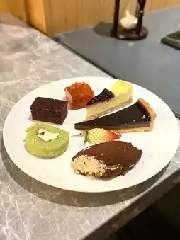 Desserts include cheesecake, Tiramisu, and chocolate tart. Each piece is small. You can try a few more. The milk ice cream is smooth and milky. The Tiramisu is also good. The chocolate tart chocolate is very rich and not sweet.