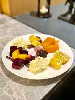 The largest selection of salad styles, in addition to fresh salad vegetables, potato salad, beetroot salad, beetroot salad, Thai papaya salad, crab egg salad, sweet potato smoked duck breast salad, kale salad, potato salad, mayonnaise grilled pumpkin, Cold cut several hams with shrimp, mussels and mussels