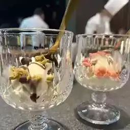 Tofu ice cream, can relieve the spiciness, moderate sweetness, sprinkled with a little crunchy and chocolate sauce on top