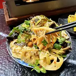 🥗 I also ordered a vegetable-based salad, including lotus root slices, dried bean curd sheets, wood ear mushrooms, kelp, and shiitake mushroom leaves. The salad came with the toppings: peanuts, shredded cucumber, cilantro, and soybean sprouts. The slightly spicy flavor and refreshing texture were a delightful appetizer.