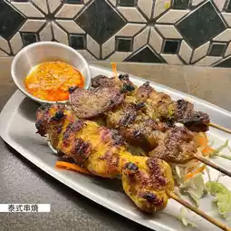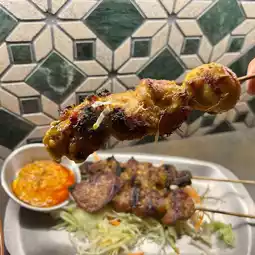 Grilled to order, the skewers are rich in lemongrass flavor, served with textured peanuts with satay sauce.