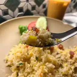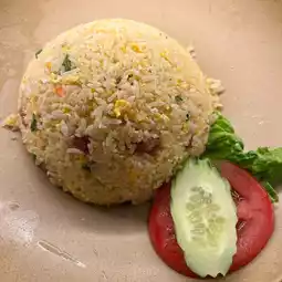 Quite special. Stir-fried with three-coloured peppers and dried Chinese sausage. The golden rice grains are distinct and not stuck together, the rice bowl lid out in a semi-circle is quite good to take pictures.