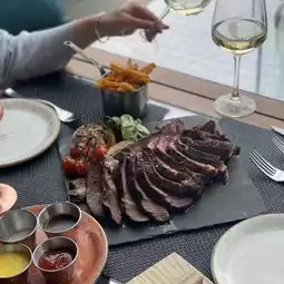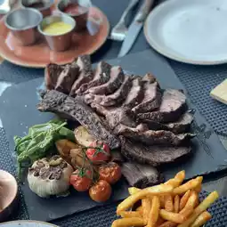 Top-quality bone-in rib-eye steak from the US๏ฝCrispy fries and roasted potatoes