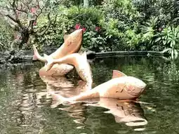 Walking along seaside from Golden Beach, Tuenmun, cutting into the pavement towards the Hong Kong Gold Coast Hotel, enjoying the wonderful views from both side with bushes and plants, passing the gold fish pond of dancing golden dolphin statues with mini waterfall. Witnessing the gold fish playing happily In the water. Probably is the Chinese Fung Sui of Gold Coast Hotel.