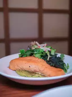 The salmon is seasoned with Japanese soy sauce and honey and then baked. The medium-rare meat is very tender and has no fishy smell.