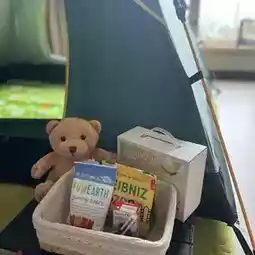 Marine's favorite is the camping tent 🎪 prepared for her by the hotel staff! Not only does the child's favorite snacks and drinks 🍪🍬, but also a cute bear teddy bear 🐻 to accompany him camping. That night he fell asleep with Bear Bearing in his arms and him inside the camping tent. 🥰