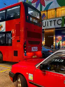 And in front of them, there are a ton of red buses and taxis that give off a Hong Kong vibe! I should take a picture here that captures all the Hong Kong vibes, right?