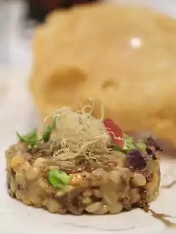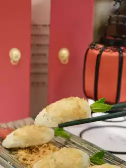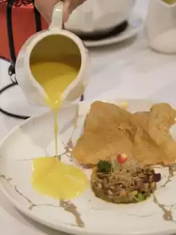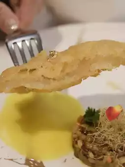 This dish is quite special. The crispy fish maw has a crispy skin and a chewy texture inside! It is served with brown and red rice, and the saffron sauce is very delicious!