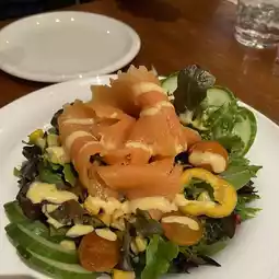 The colorful salad includes cucumber, lettuce 🥬 and corn 🌽. The ingredients are fresh and the smoked salmon is plump and tender.
