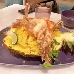 Another dish is pineapple minced seafood fried rice. 🍚 Once on the table, you can see that the dish is very full of ingredients, the portion of fried shrimp and pineapple seafood is enough, 🔥 fry up with pan, cooking time controlled very appropriately.
